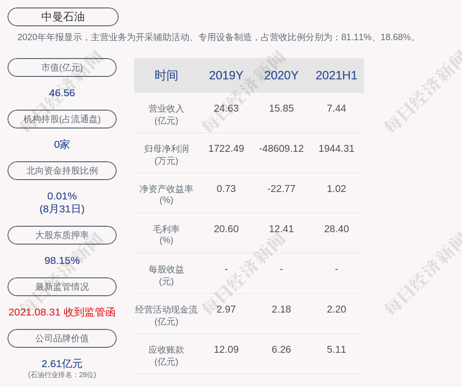 2020年年報(bào)顯示,中曼石油的主營(yíng)業(yè)務(wù)為開(kāi)采輔助活動(dòng)、專用設(shè)備制造,占營(yíng)收比例分別為:81.11%、18.68%。