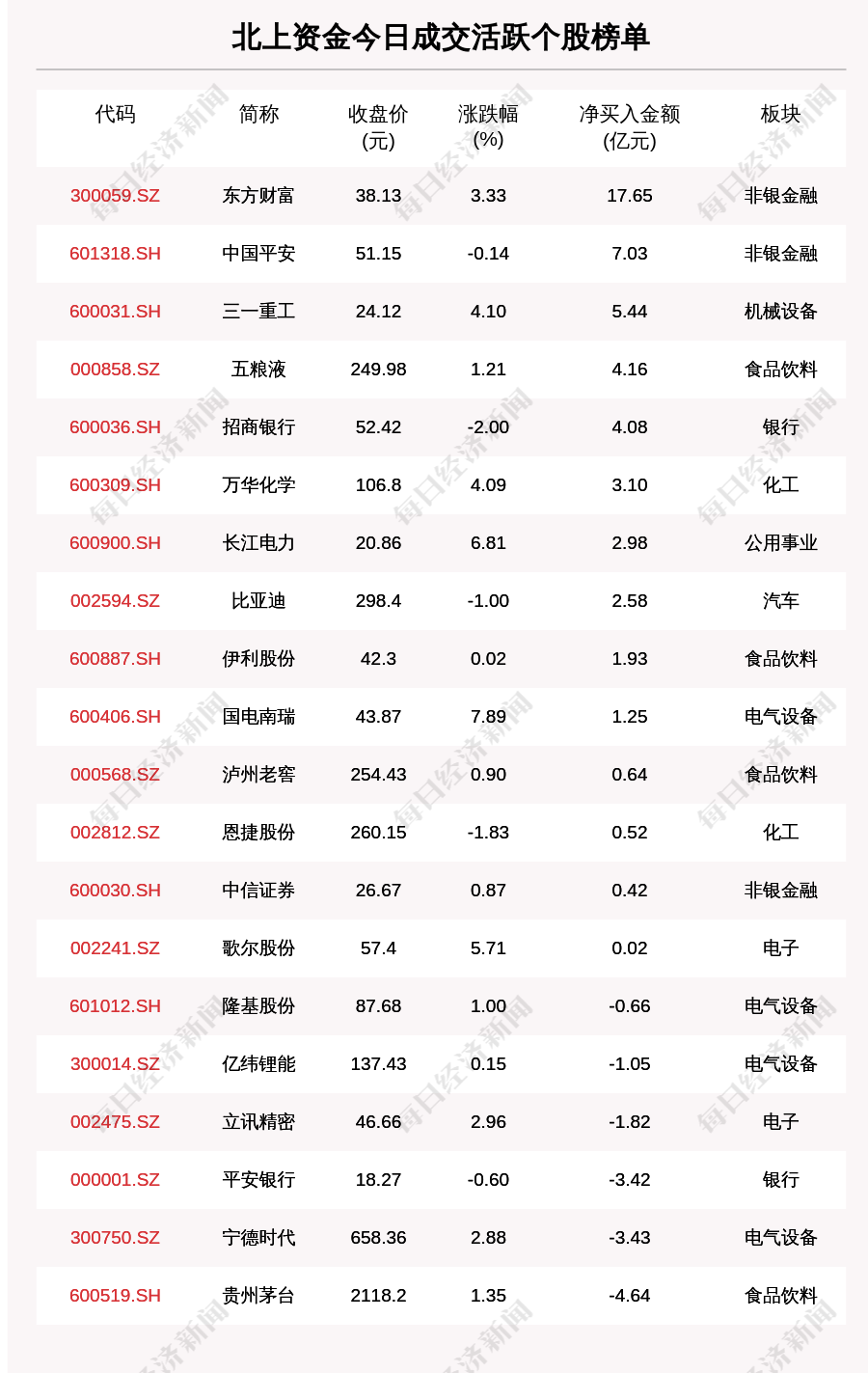 12月13日,北上資金成交活躍個(gè)股榜單中,凈買入個(gè)股共14只,金額最多的是東方財(cái)富(300059.SZ,收盤價(jià):38.13元),凈買入17.650億元;凈賣出個(gè)股共6只,金額最多的是貴州茅臺(tái)(600519.SH,收盤價(jià):2118.2元),凈賣出4.644億元。