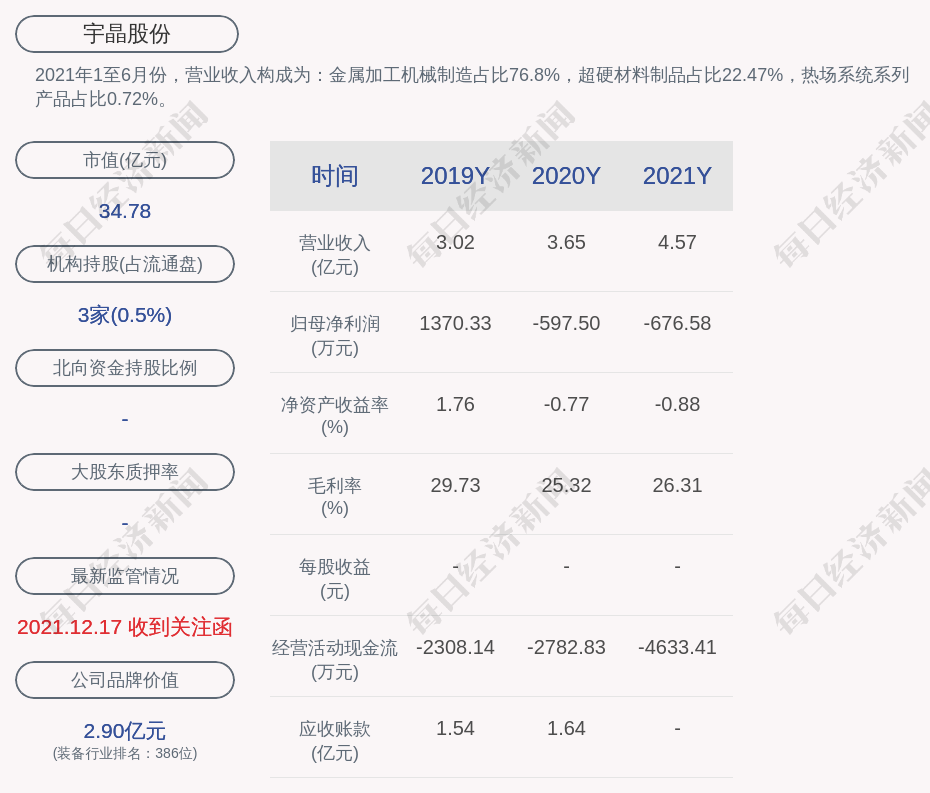 2021年1至6月份,宇晶股份的營業(yè)收入構(gòu)成為:金屬加工機(jī)械制造占比76.8%,超硬材料制品占比22.47%,熱場系統(tǒng)系列產(chǎn)品占比0.72%。