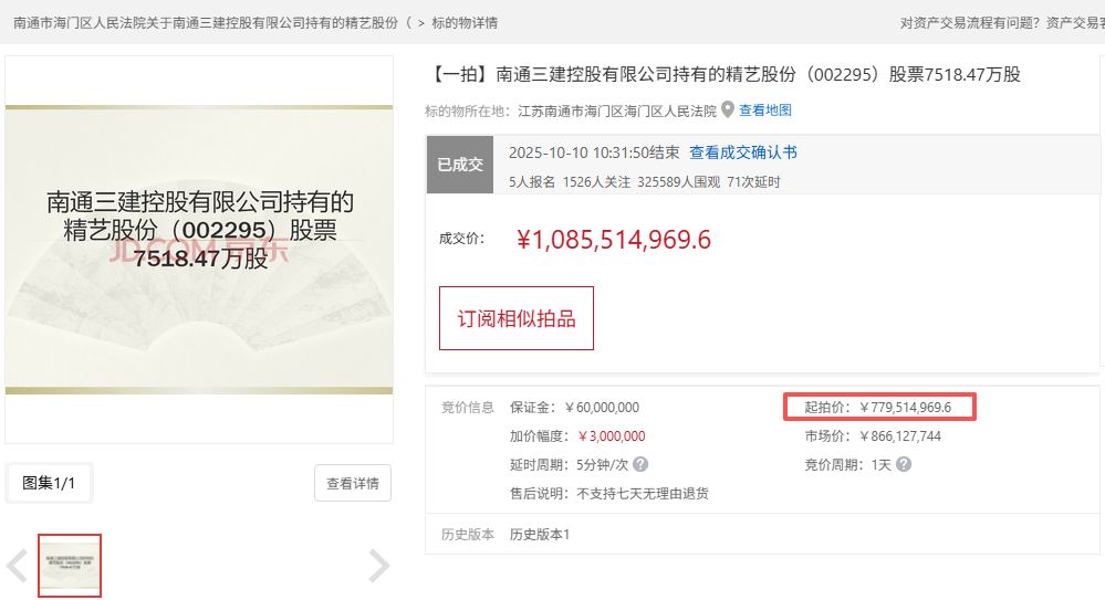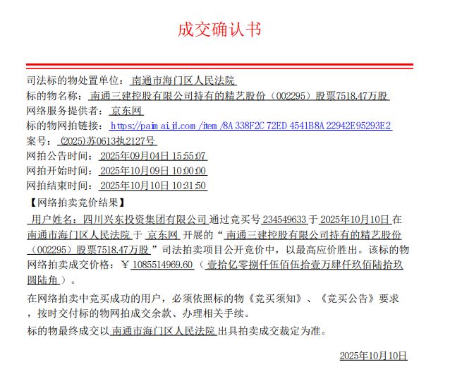 精藝股份10月10日(周五)晚間公告稱,公司控股股東南通三建控股有限公司(下稱三建控股)所持有的7518.47萬(wàn)股公司股份(占公司總股本的29.99996%)網(wǎng)拍階段已經(jīng)結(jié)束,四川興東投資集團(tuán)有限公司(下稱四川興東)以約10.86億元的總價(jià)款競(jìng)得。