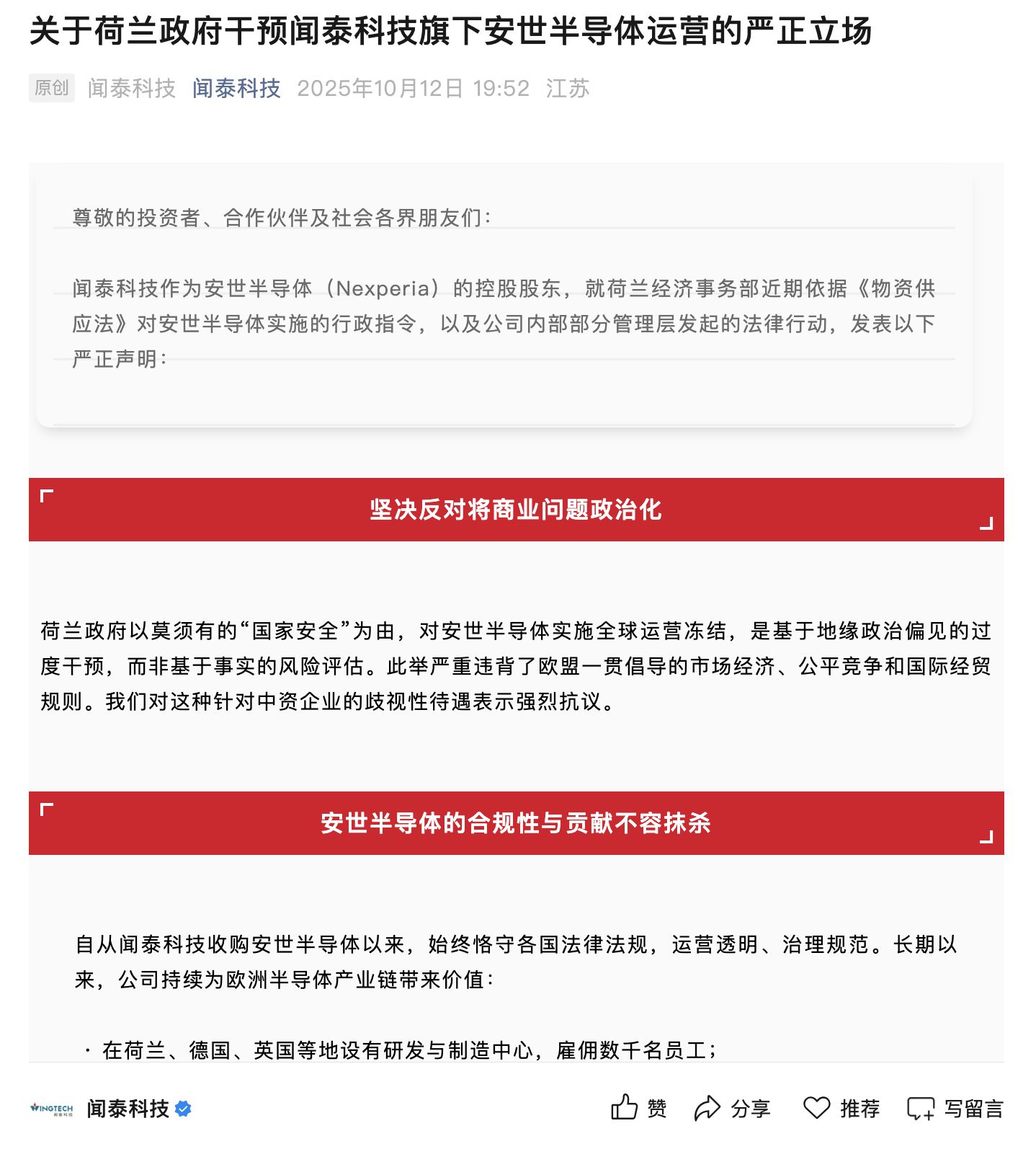 10月12日晚間,聞泰科技發(fā)表聲明稱,荷蘭政府以莫須有的“國家安全”為由,對(duì)安世半導(dǎo)體實(shí)施全球運(yùn)營凍結(jié),是基于地緣政治偏見的過度干預(yù),而非基于事實(shí)的風(fēng)險(xiǎn)評(píng)估。此舉嚴(yán)重違背了歐盟一貫倡導(dǎo)的市場(chǎng)經(jīng)濟(jì)、公平競(jìng)爭(zhēng)和國際經(jīng)貿(mào)規(guī)則。