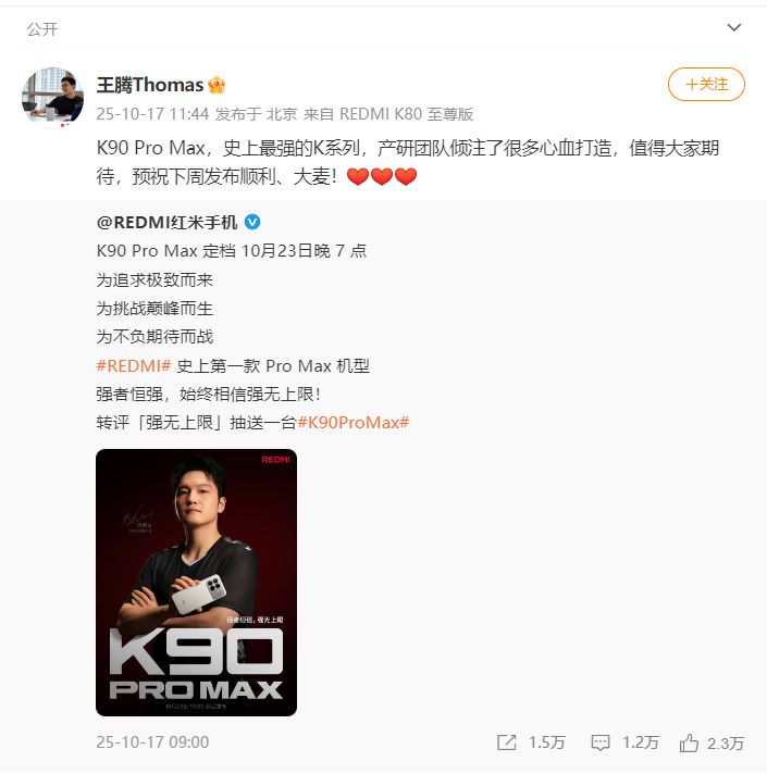 值得注意的是,10月17日前小米高管 王騰Thomas轉(zhuǎn)發(fā)紅米手機(jī)官方推文并表示:K90 Pro Max,史上最強(qiáng)的K系列,產(chǎn)研團(tuán)隊(duì)傾注了很多心血打造,值得大家期待,預(yù)祝下周發(fā)布順利、大麥!