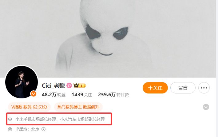 查看魏思琪社交媒體賬號(hào),認(rèn)證信息已顯示為“小米手機(jī)市場(chǎng)部總經(jīng)理,小米汽車市場(chǎng)部副總經(jīng)理”。