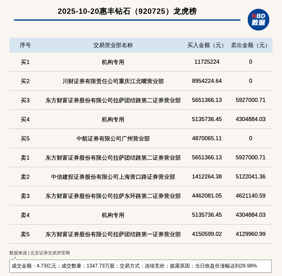 每經(jīng)訊,2025年10月20日,北交所上市公司惠豐鉆石(920725,收盤價(jià):39.32元)登上龍虎榜,交易方式是連續(xù)競(jìng)價(jià),披露原因是當(dāng)日收盤價(jià)漲幅達(dá)到29.98%,成交數(shù)量1347.73萬股,成交金額4.73億元。買一席位為機(jī)構(gòu)專用,買入1172.52萬元;賣一席位為東方財(cái)富證券股份有限公司拉薩團(tuán)結(jié)路第二證券營業(yè)部,賣出592.7萬元。