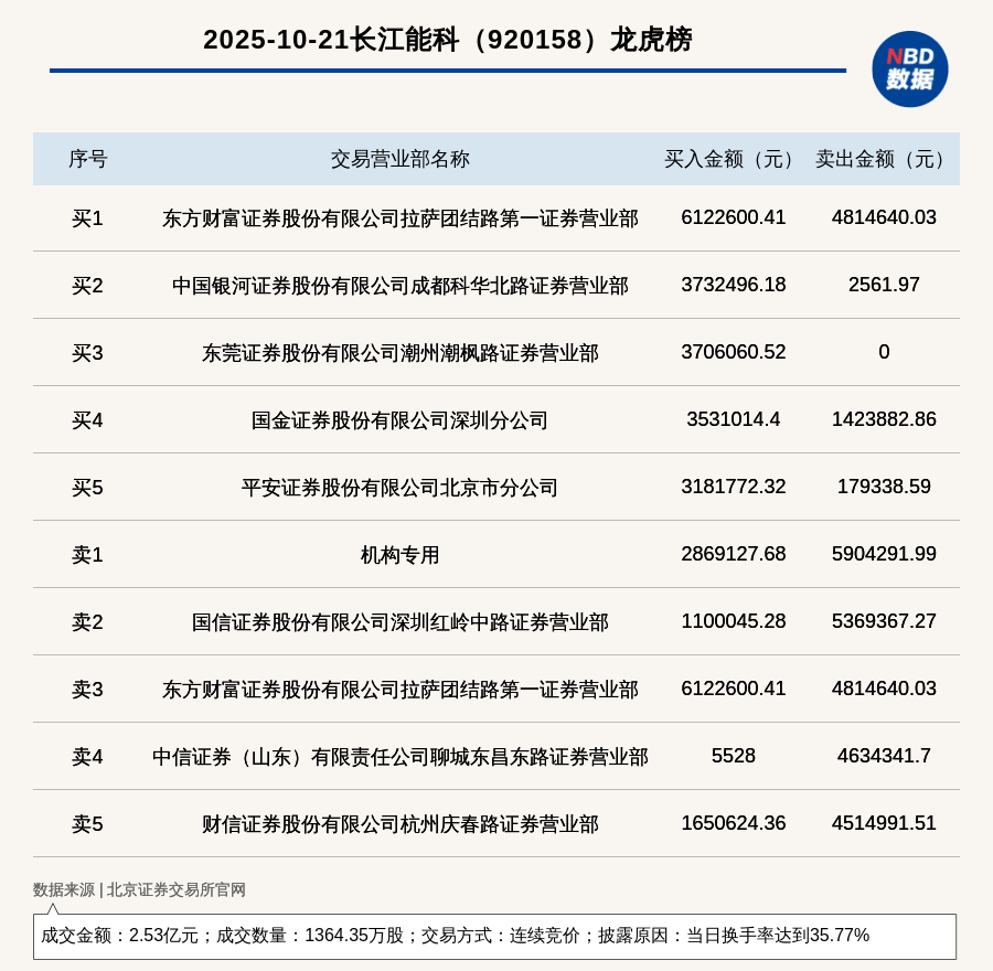 每經(jīng)訊,2025年10月21日,北交所上市公司長江能科(920158,收盤價:18.55元)登上龍虎榜,交易方式是連續(xù)競價,披露原因是當(dāng)日換手率達到35.77%,成交數(shù)量1364.35萬股,成交金額2.53億元。買一席位為東方財富證券股份有限公司拉薩團結(jié)路第一證券營業(yè)部,買入612.26萬元;賣一席位為機構(gòu)專用,賣出590.43萬元。