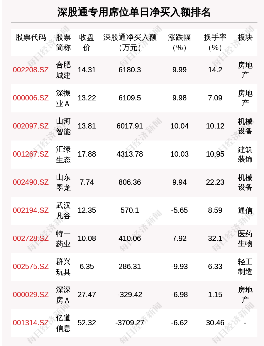 在龍虎榜中,涉及深股通專用席位的個股有10只,合肥城建的深股通專用席位凈買入額最大,凈買入6180.3萬元。