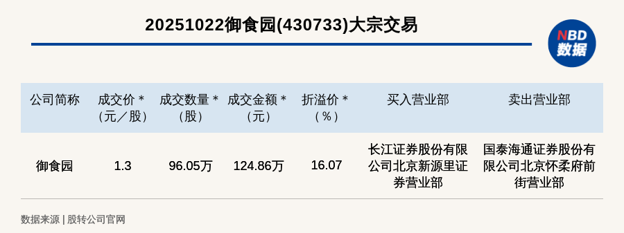 每經訊,2025年10月22日,新三板基礎層公司御食園(430733,收盤價:1.12元)發(fā)生一筆大宗交易,成交價1.3元/股,成交數量96.05萬股,成交金額124.86萬元,溢價16.07%。買入營業(yè)部是長江證券股份有限公司北京新源里證券營業(yè)部,賣出營業(yè)部是國泰海通證券股份有限公司北京懷柔府前街營業(yè)部。