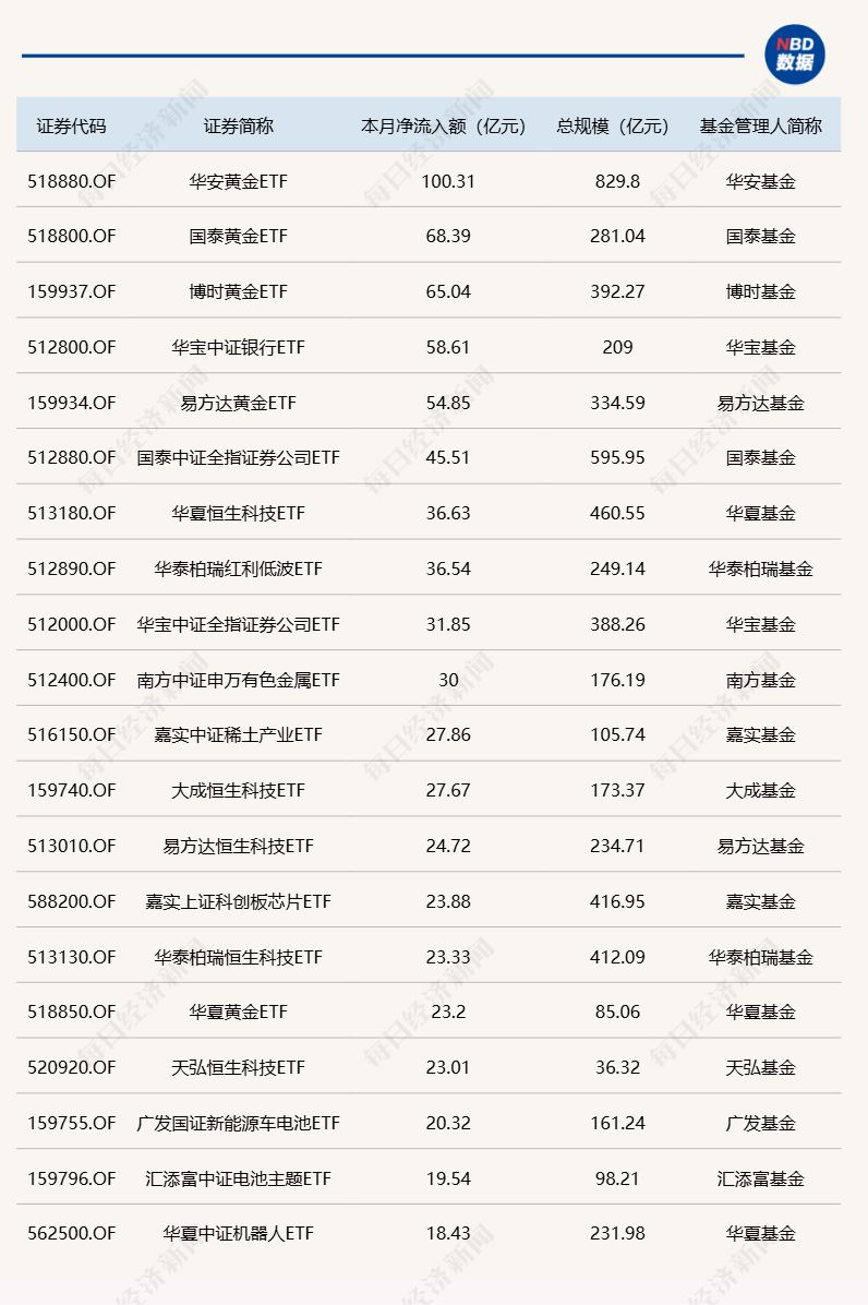 截至10月24日,本月資金凈流入額居前20的ETF名單如下:
