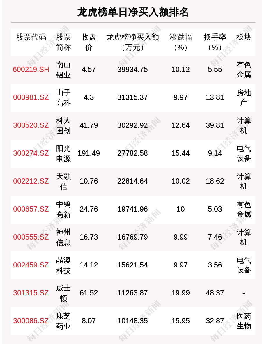 每經(jīng)AI快訊,10月29日,共有42只個(gè)股上榜龍虎榜,南山鋁業(yè)龍虎榜單日凈買入額最多,達(dá)3.99億元。