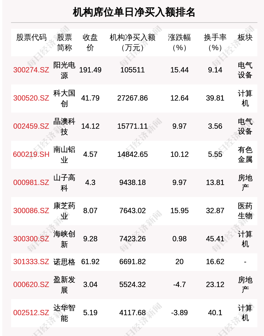 在龍虎榜中,涉及機(jī)構(gòu)專用席位的個(gè)股有30只,凈買入額前三的是陽(yáng)光電源、科大國(guó)創(chuàng)、晶澳科技,分別為10.55億元、2.73億元、1.58億元。