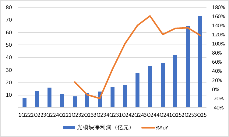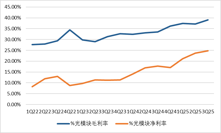 由于目前尚無光模塊的行業(yè)分類,我們以wind光模塊概念指數(shù)成分股作為分析樣本。2025Q3單季度實(shí)現(xiàn)營業(yè)收入295.90億元,yoy+56.0%。凈利潤73.36億元,yoy+118.8%。2025Q3單季銷售毛利率/銷售凈利率分別為39.07%/24.79%,分別yoy+5.59pct/+7.12pct。
