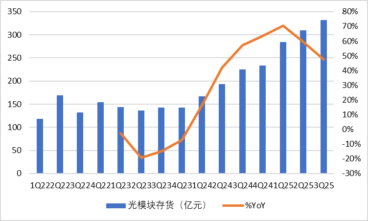 如何布局光模塊產(chǎn)業(yè)?從光模塊生產(chǎn)特征看,存貨對(duì)于短期業(yè)績釋放節(jié)奏具備較強(qiáng)指引能力。2025Q3末存貨余額為332.12億元,yoy+47.6%,qoq+7.44%。我們預(yù)期伴隨下游算力芯片持續(xù)釋放,光模塊業(yè)績動(dòng)能強(qiáng)勁。有興趣的投資者可關(guān)注通信ETF(515880)、創(chuàng)業(yè)板人工智能ETF(159388)。