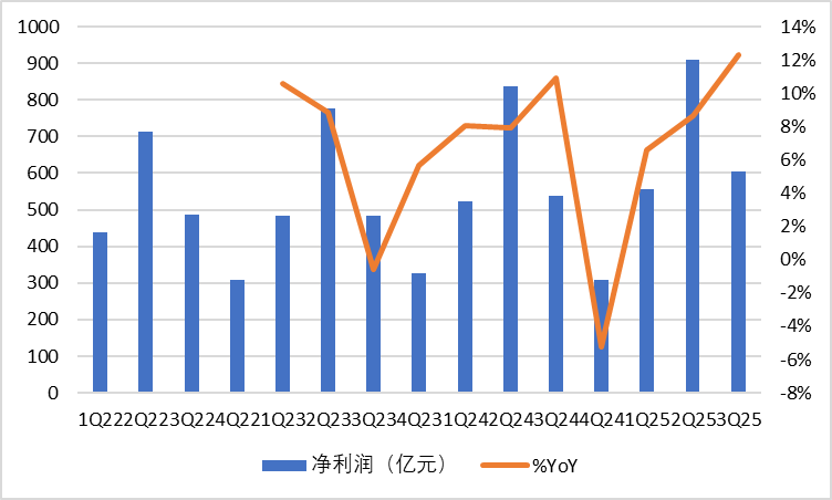 2025Q3單季度共凈利潤603.05億元,yoy+12.3%。