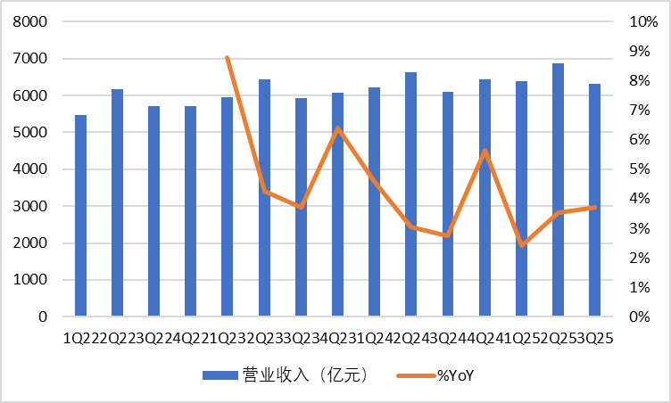 2025Q3單季度共實(shí)現(xiàn)營業(yè)收入6321.00億元,yoy+3.7%。