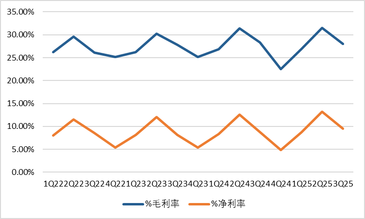 盈利能力方面,2025Q3單季銷售毛利率/銷售凈利率分別為27.97%/9.54%,分別yoy-0.40pct/+0.73pct。