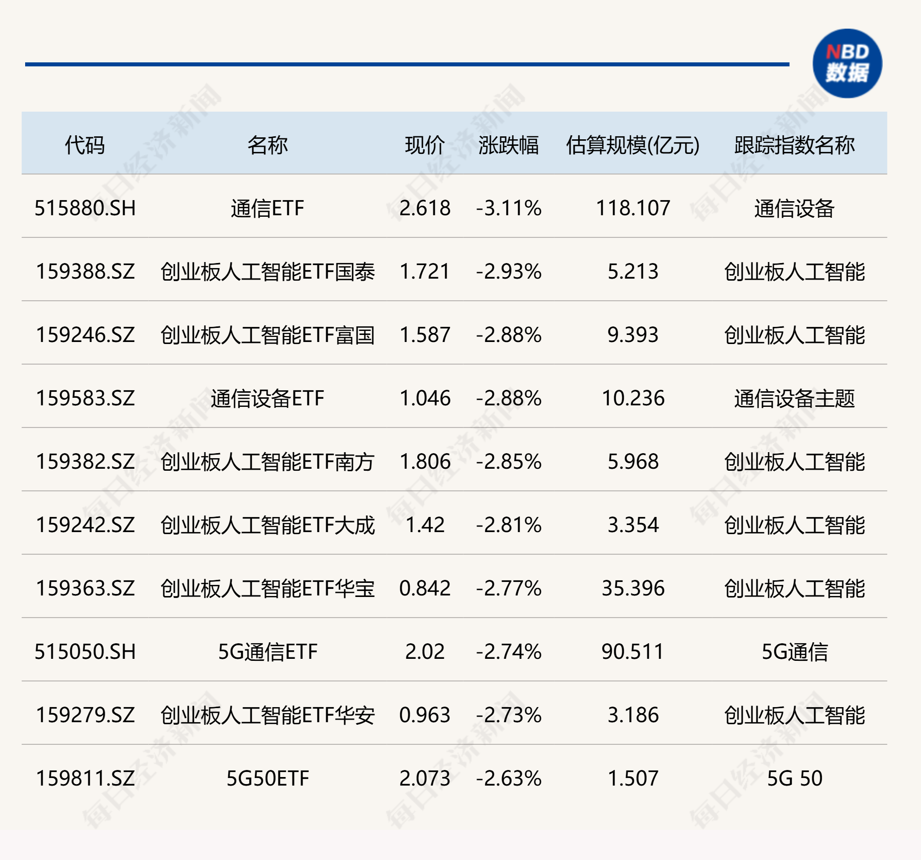 下跌方面,通信、創(chuàng)業(yè)板人工智能相關(guān)ETF跌約3%。