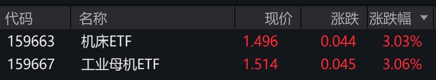 受盤(pán)面影響,機(jī)床ETF、工業(yè)母機(jī)ETF漲超3%。