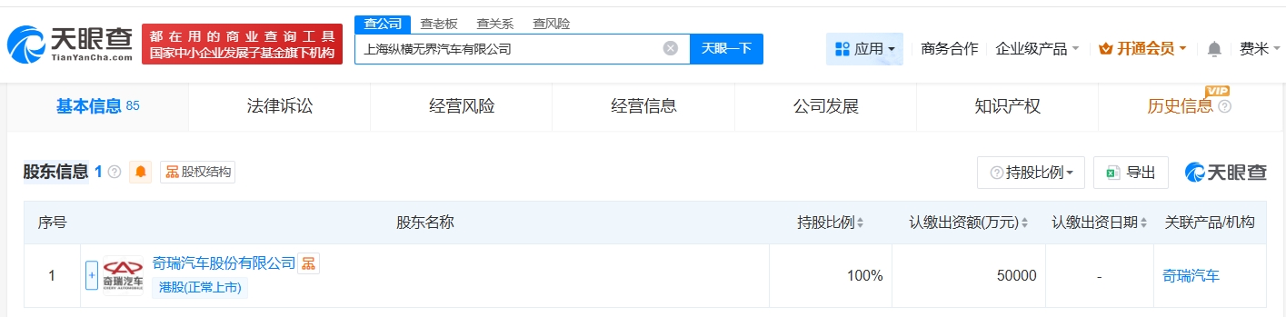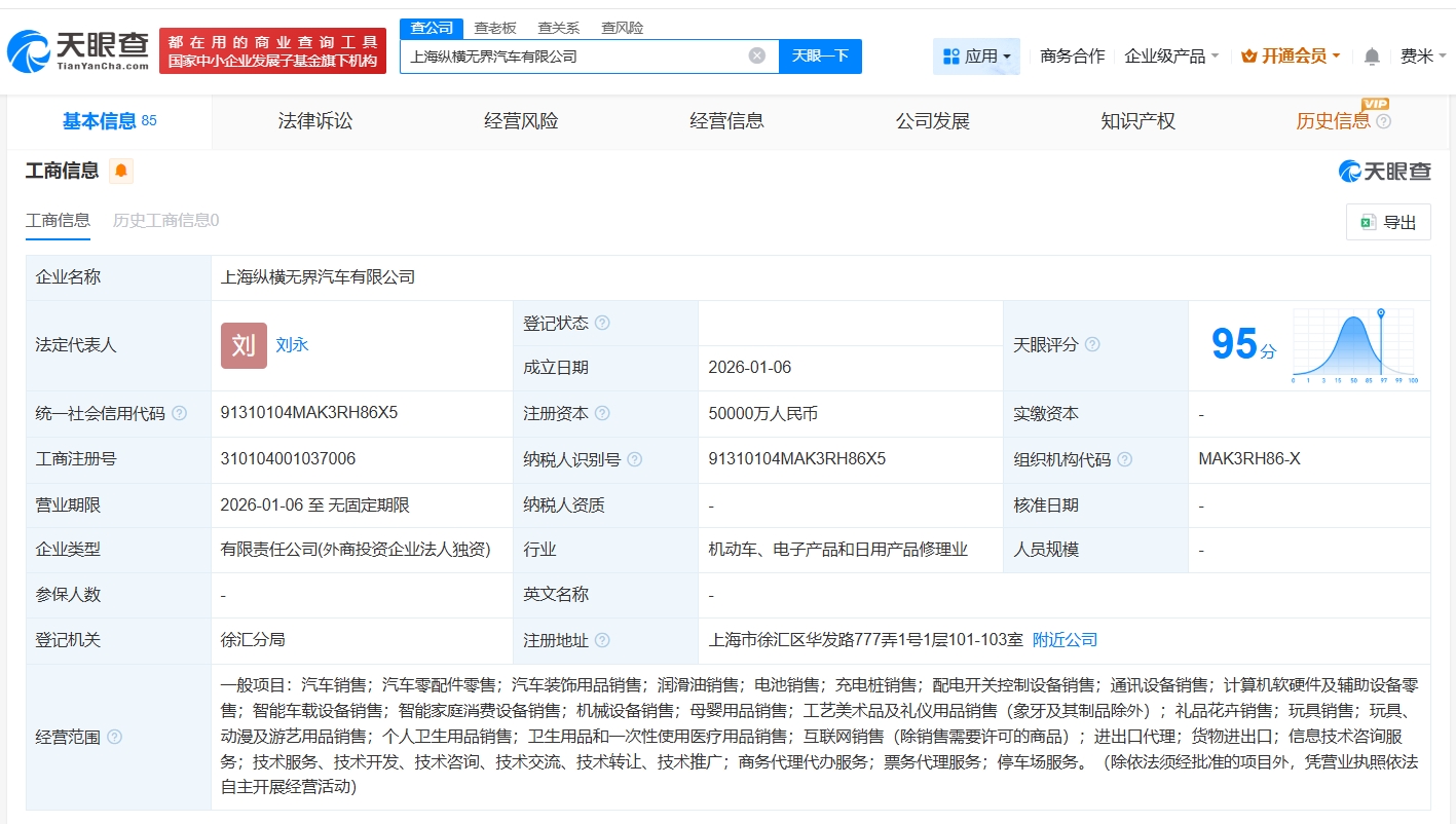 每經(jīng)AI快訊,天眼查工商信息顯示,1月6日,上??v橫無界汽車有限公司成立,法定代表人為劉永,注冊資本5億元人民幣,經(jīng)營范圍包括汽車銷售、汽車零配件零售、汽車裝飾用品銷售、潤滑油銷售等。股東信息顯示,該公司由奇瑞汽車股份有限公司全資持股。