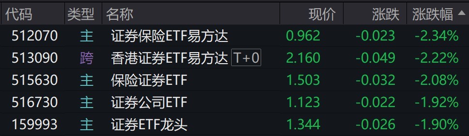 受盤面影響,證券保險相關(guān)ETF跌約2%。