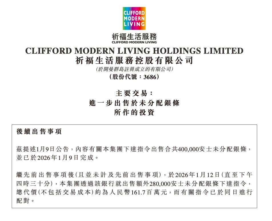 1月12日晚間,祈福生活服務(wù)公告稱,已下單交易28萬(wàn)安士銀條(1安士約等于31.1035克),總代價(jià)約1.62億元,預(yù)計(jì)收益1.04億元;該公司此前于1月7日下達(dá)40萬(wàn)安士銀條出售指令,1月9日公告完成交易并獲利1.43億元。