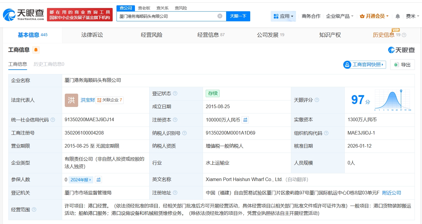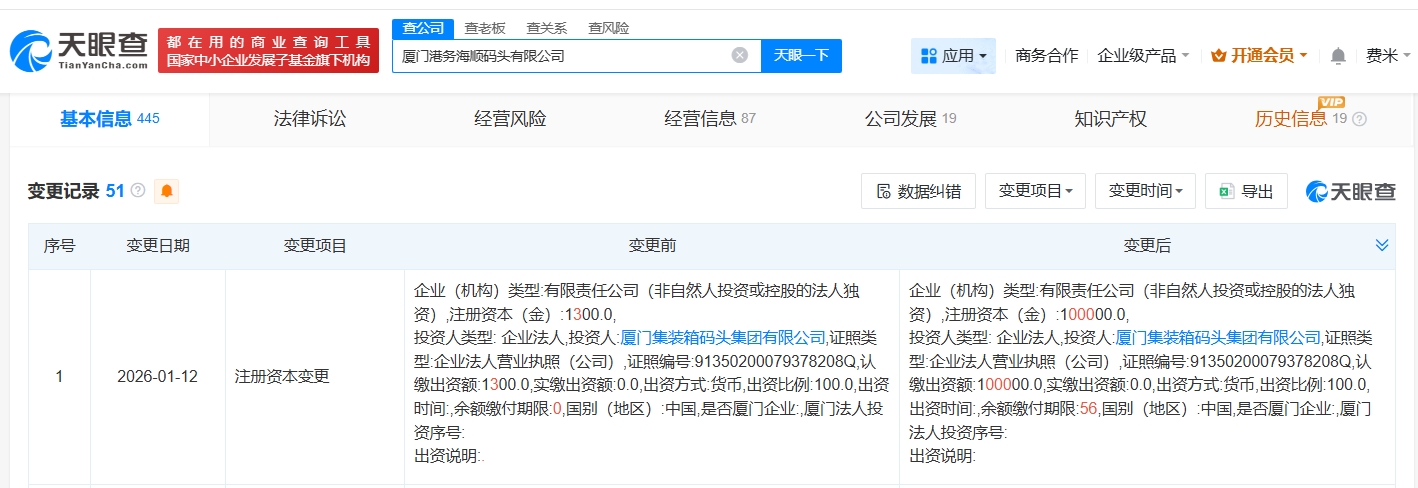 每經AI快訊,1月15日,天眼查工商信息顯示,近日,廈門港務海順碼頭有限公司發(fā)生工商變更,注冊資本由1300萬元人民幣增至10億元人民幣,增幅約7592%。廈門港務海順碼頭有限公司成立于2015年8月,法定代表人為洪寶財,經營范圍為港口經營、港口貨物裝卸搬運活動、船舶港口服務、港口設施設備和機械租賃維修業(yè)務。股東信息顯示,該公司由廈門集裝箱碼頭集團有限公司全資持股。