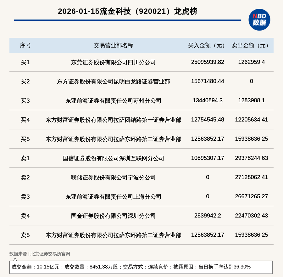每經(jīng)訊,2026年1月15日,北交所上市公司流金科技(920021,收盤價(jià):11.33元)登上龍虎榜,交易方式是連續(xù)競(jìng)價(jià),披露原因是當(dāng)日換手率達(dá)到36.30%,成交數(shù)量8451.38萬(wàn)股,成交金額10.15億元。買一席位為東莞證券股份有限公司四川分公司,買入2509.59萬(wàn)元;賣一席位為國(guó)信證券股份有限公司深圳互聯(lián)網(wǎng)分公司,賣出2937.82萬(wàn)元。