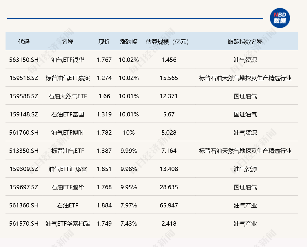 ETF漲跌幅方面,多只油氣相關(guān)ETF漲停。