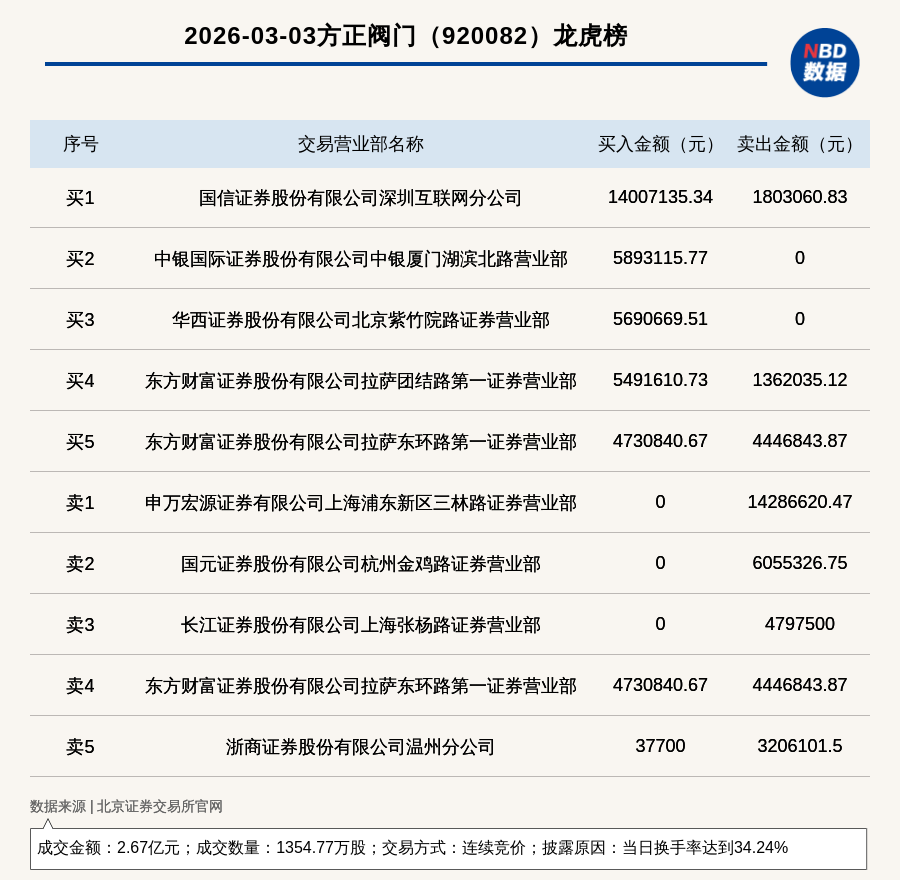 每經(jīng)訊,2026年3月3日,北交所上市公司方正閥門(920082,收盤價:20.08元)登上龍虎榜,交易方式是連續(xù)競價,披露原因是當日換手率達到34.24%,成交數(shù)量1354.77萬股,成交金額2.67億元。買一席位為國信證券股份有限公司深圳互聯(lián)網(wǎng)分公司,買入1400.71萬元;賣一席位為申萬宏源證券有限公司上海浦東新區(qū)三林路證券營業(yè)部,賣出1428.66萬元。