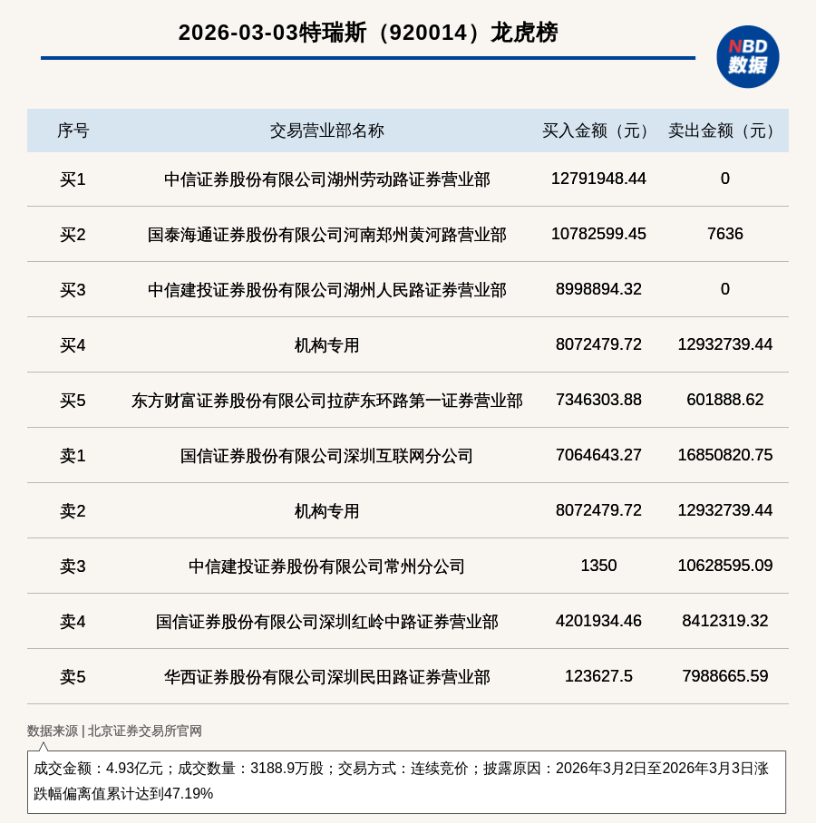 每經(jīng)訊,2026年3月3日,北交所上市公司特瑞斯(920014,收盤價:17.81元)登上龍虎榜,交易方式是連續(xù)競價,披露原因是2026年3月2日至2026年3月3日漲跌幅偏離值累計(jì)達(dá)到47.19%,成交數(shù)量3188.9萬股,成交金額4.93億元。買一席位為中信證券股份有限公司湖州勞動路證券營業(yè)部,買入1279.19萬元;賣一席位為國信證券股份有限公司深圳互聯(lián)網(wǎng)分公司,賣出1685.08萬元。