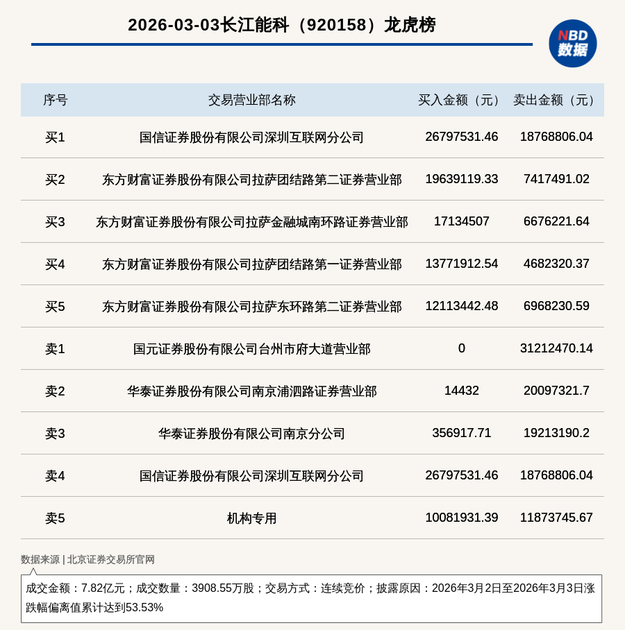 每經(jīng)訊,2026年3月3日,北交所上市公司長(zhǎng)江能科(920158,收盤(pán)價(jià):23.79元)登上龍虎榜,交易方式是連續(xù)競(jìng)價(jià),披露原因是2026年3月2日至2026年3月3日漲跌幅偏離值累計(jì)達(dá)到53.53%,成交數(shù)量3908.55萬(wàn)股,成交金額7.82億元。買(mǎi)一席位為國(guó)信證券股份有限公司深圳互聯(lián)網(wǎng)分公司,買(mǎi)入2679.75萬(wàn)元;賣(mài)一席位為國(guó)元證券股份有限公司臺(tái)州市府大道營(yíng)業(yè)部,賣(mài)出3121.25萬(wàn)元。