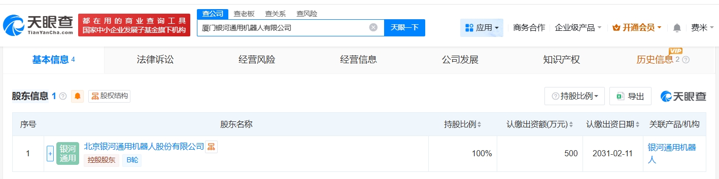 每經(jīng)AI快訊,天眼查App顯示,3月4日,廈門銀河通用機(jī)器人有限公司成立,法定代表人為姚騰洲,注冊資本500萬元人民幣,經(jīng)營范圍含服務(wù)消費(fèi)機(jī)器人制造、服務(wù)消費(fèi)機(jī)器人銷售、智能機(jī)器人的研發(fā)等。股東信息顯示,該公司由北京銀河通用機(jī)器人股份有限公司全資持股。