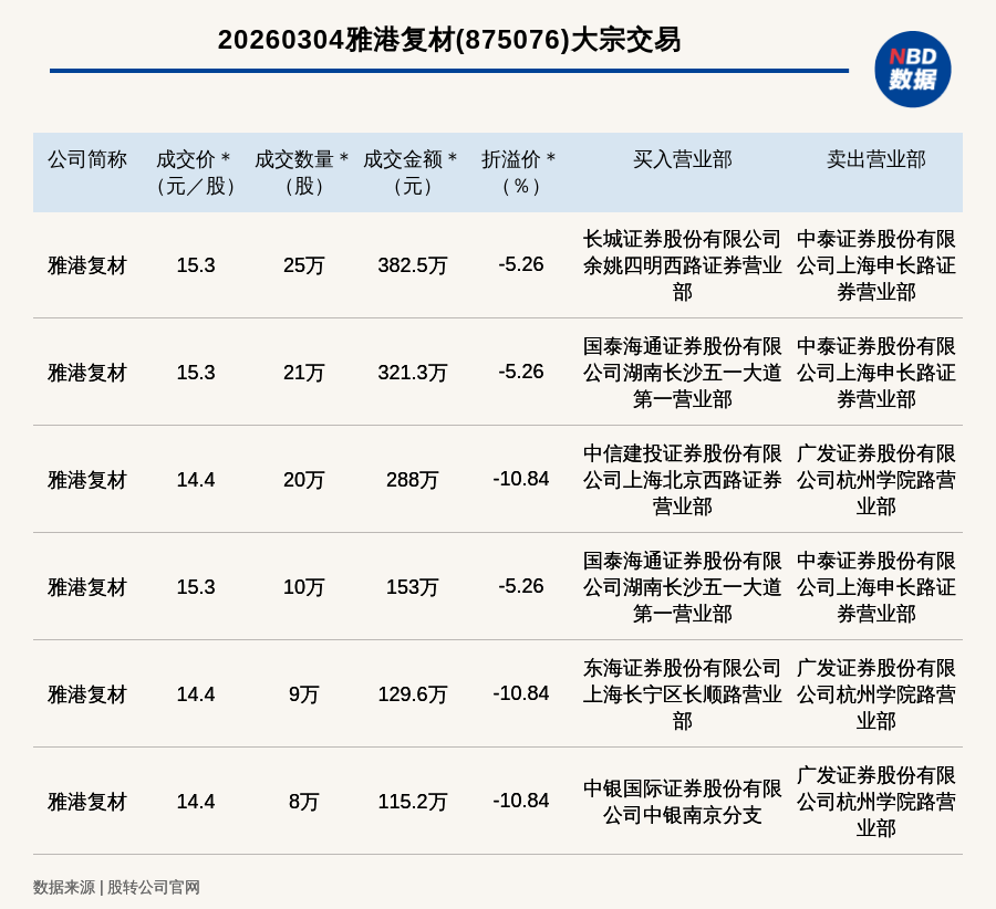 每經(jīng)訊,2026年3月4日,新三板基礎(chǔ)層公司雅港復(fù)材(875076,收盤價(jià):16.15元)發(fā)生6筆大宗交易,總成交金額為1389.6萬元,成交金額最高的一筆成交價(jià)15.3元/股,成交數(shù)量25萬股,成交金額382.5萬元,折價(jià)5.26%。買入營業(yè)部是長城證券股份有限公司余姚四明西路證券營業(yè)部,賣出營業(yè)部是中泰證券股份有限公司上海申長路證券營業(yè)部。