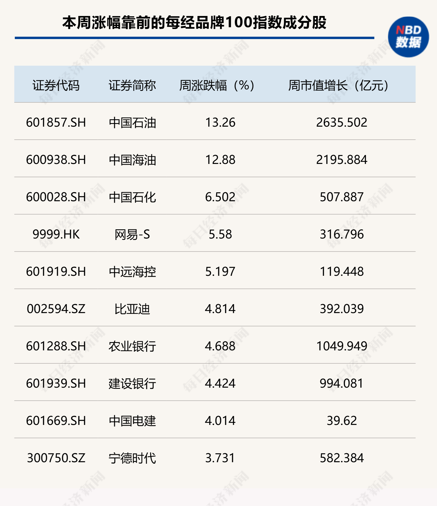 從本周每經(jīng)品牌100指數(shù)成分股表現(xiàn)來(lái)看,“三桶油”表現(xiàn)強(qiáng)勢(shì),漲幅居前。其中,中國(guó)石油周漲幅高達(dá)13.26%,周中市值一度超越農(nóng)業(yè)銀行,股價(jià)創(chuàng)近18年新高。
