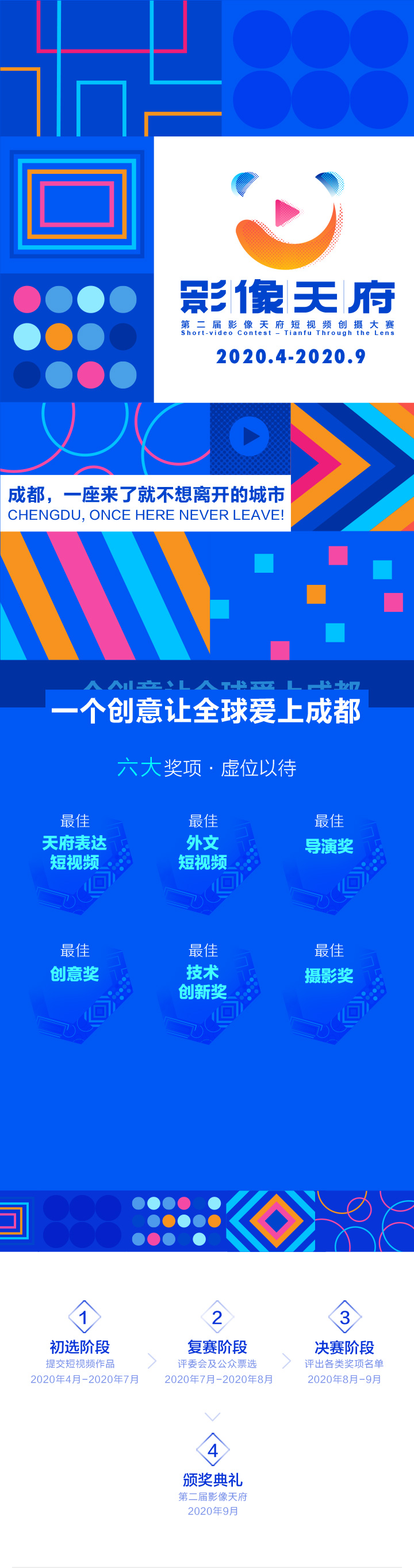 “第二屆影像天府·短視頻創(chuàng)攝大賽”于2020年4月正式啟動,邀約全球創(chuàng)攝愛好者續(xù)寫“成都,一座來了就不想離開的城市”篇章,征集優(yōu)質影像作品。本次大賽設置最佳天府表達短視頻、最佳外文短視頻、最佳導演獎、最佳創(chuàng)意獎、最佳技術創(chuàng)新獎、最佳攝影獎六大專業(yè)。評委包括中國電影家協會副主席,上海電影家協會主席任仲倫;艾美獎得主,美國著名影視導演、制片人Mark