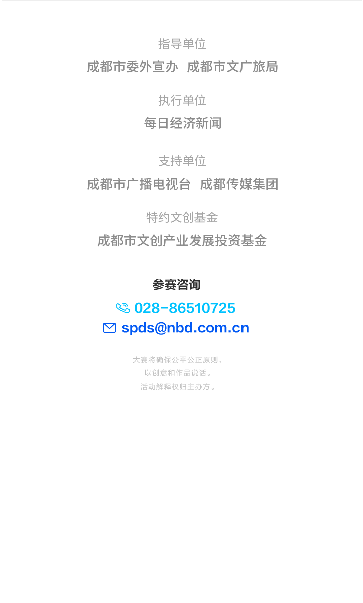 參賽者需提供①參賽個(gè)人、團(tuán)隊(duì)或機(jī)構(gòu)簡(jiǎn)介;②聯(lián)系人和聯(lián)系電話(huà)及電子郵箱;③參賽視頻的創(chuàng)意簡(jiǎn)述或腳本創(chuàng)意、制作周期(標(biāo)注參與1分鐘或3分鐘征集);④過(guò)往以城市為題創(chuàng)作的視頻代表作;⑤一句關(guān)于成都城市文化的自我表述;